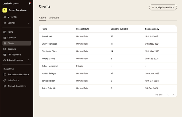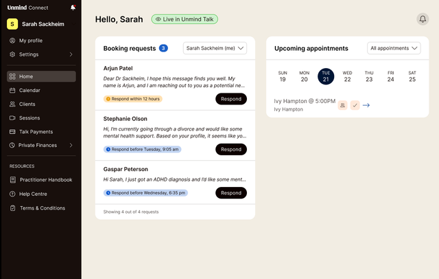 When a client sends a request, you can view it in Unmind Connect under Home > Booking Requests.